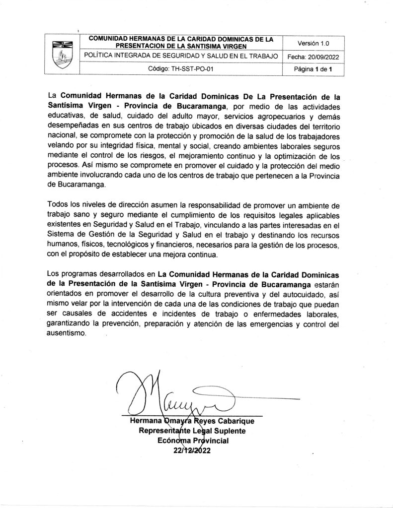 Política Integral de Seguridad y Salud en el Trabajo.